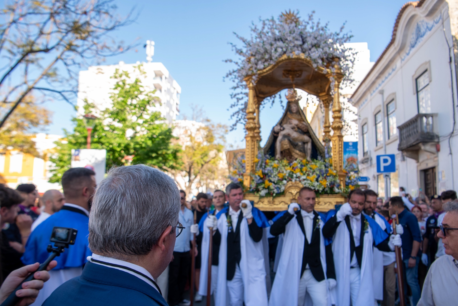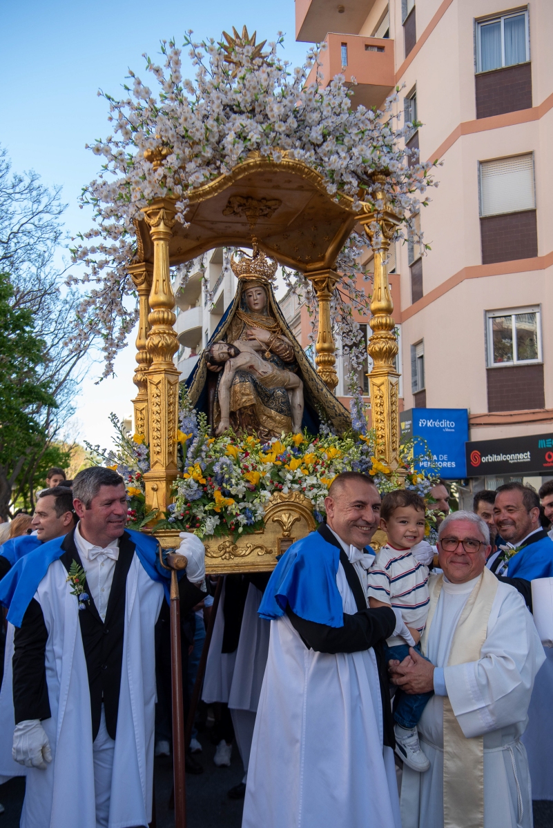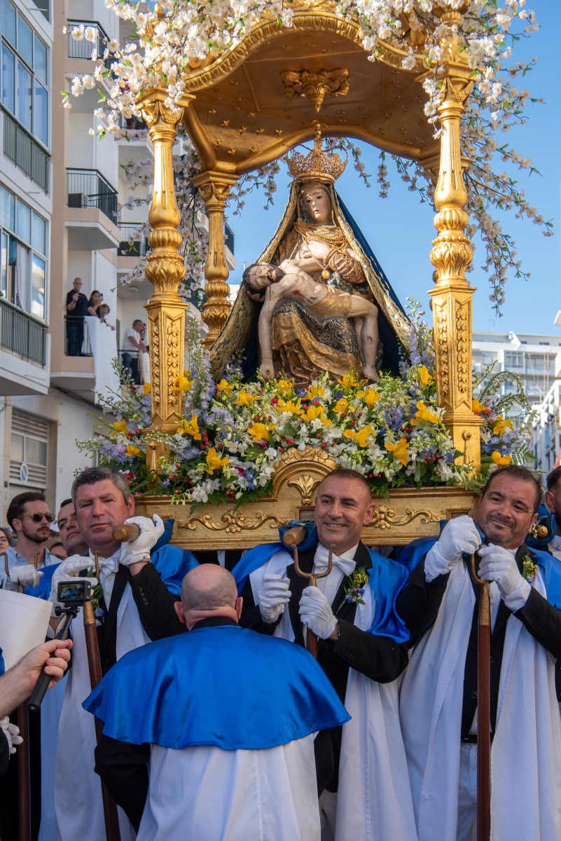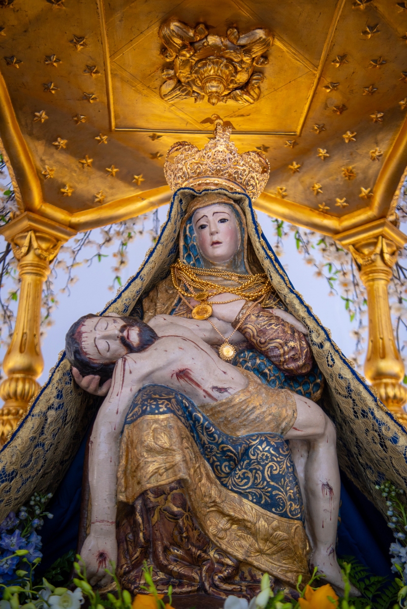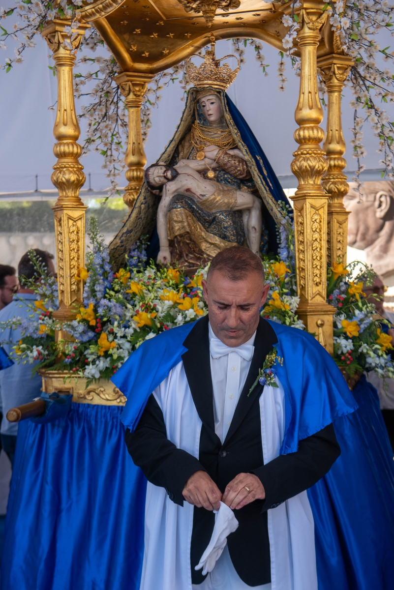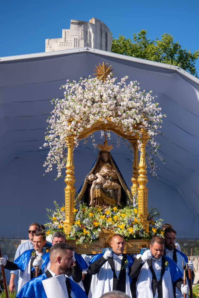 Ao esforço dos homens oito homens, vestidos de calças e opas brancas, que transportam a imagem de Virgem Maria com Jesus nos braços, aliou-se a força espiritual dos muitos milhares de fiéis que, em vivas inflamadas a Nossa Senhora da Piedade, acenando lenços ou em passo vivo e na cadência musicada dos homens da Banda Filarmónica Artistas de Minerva, «empurraram», calçada acima no calor da fé, o pesado andor da padroeira.