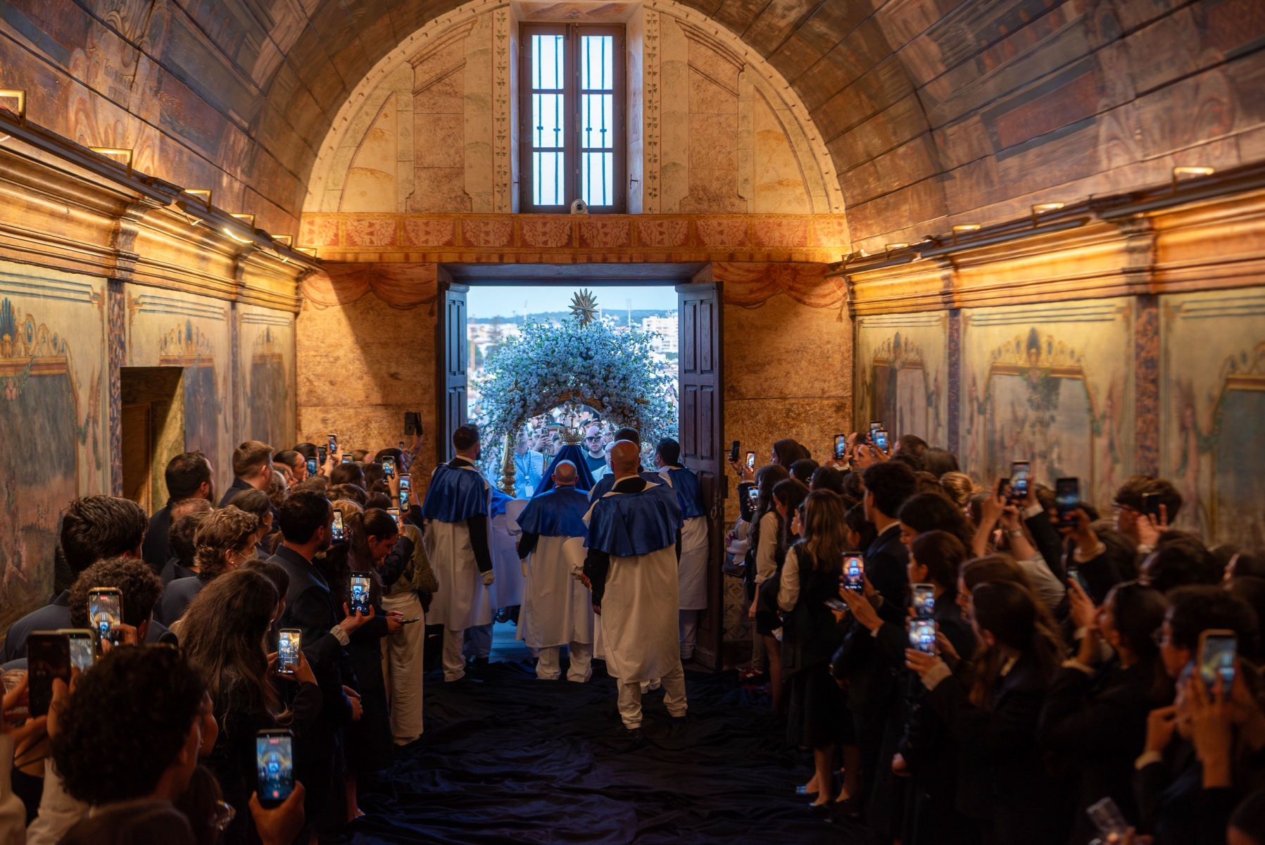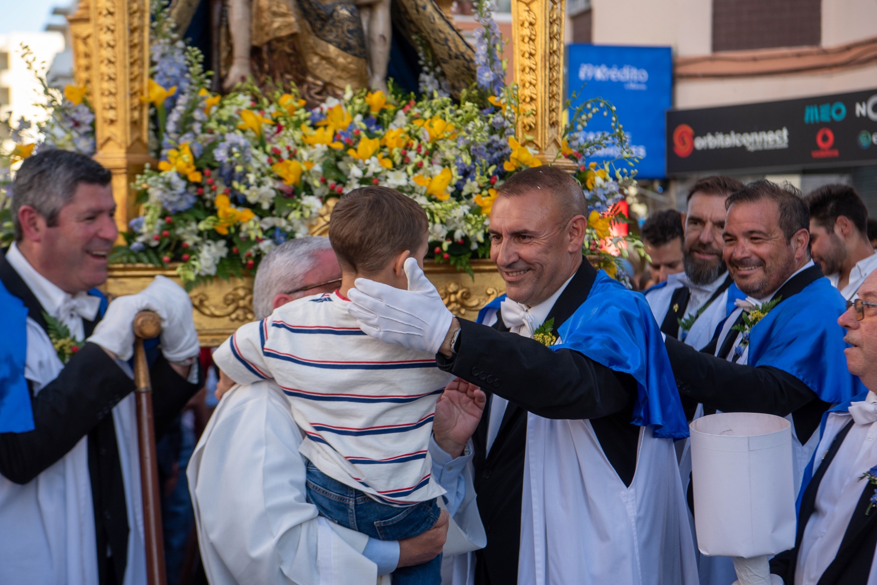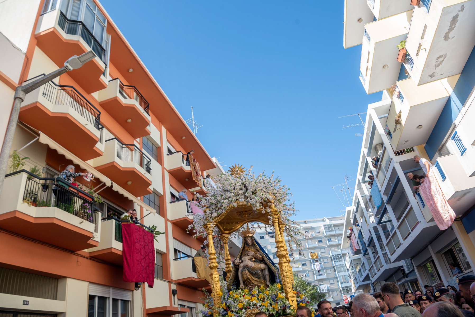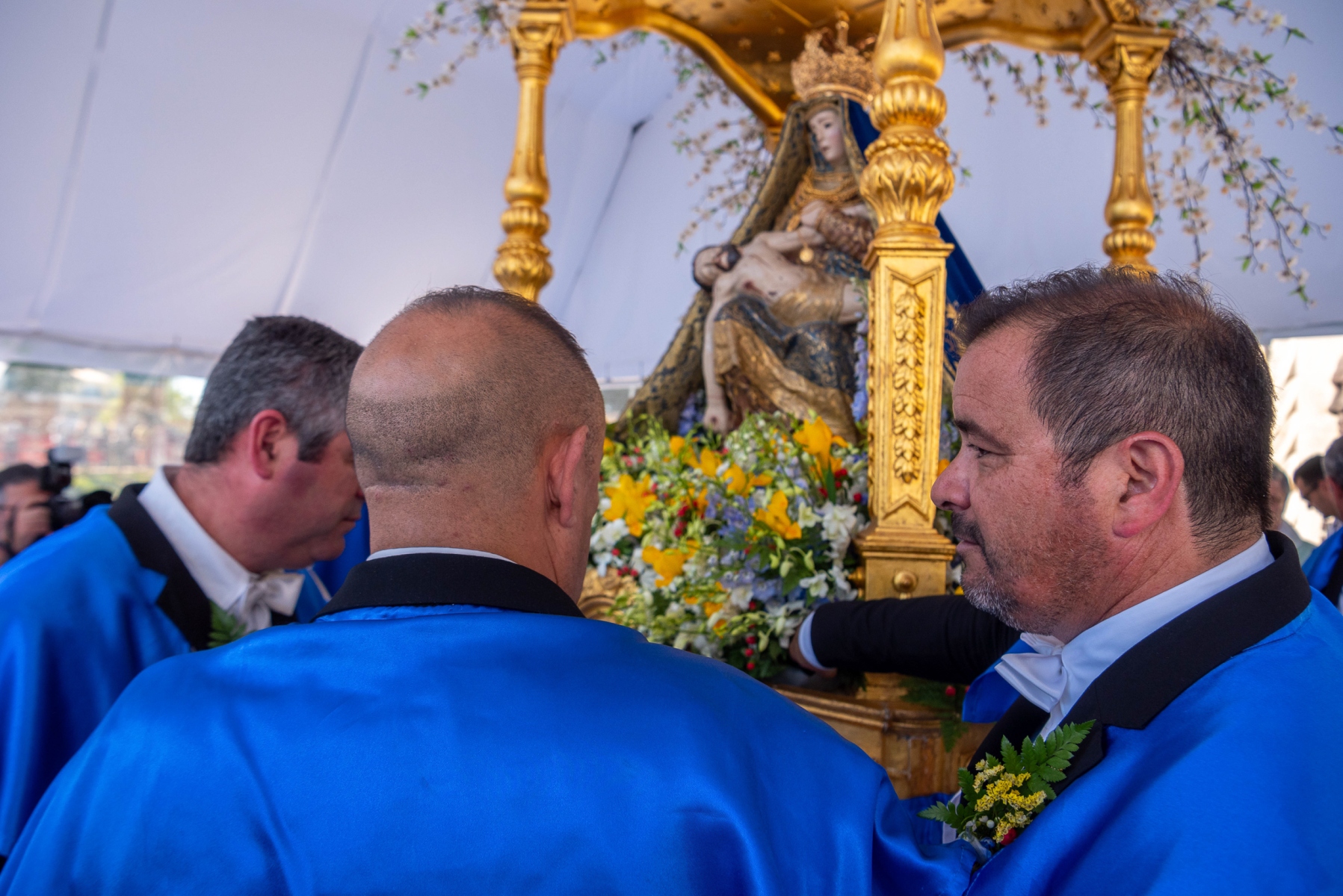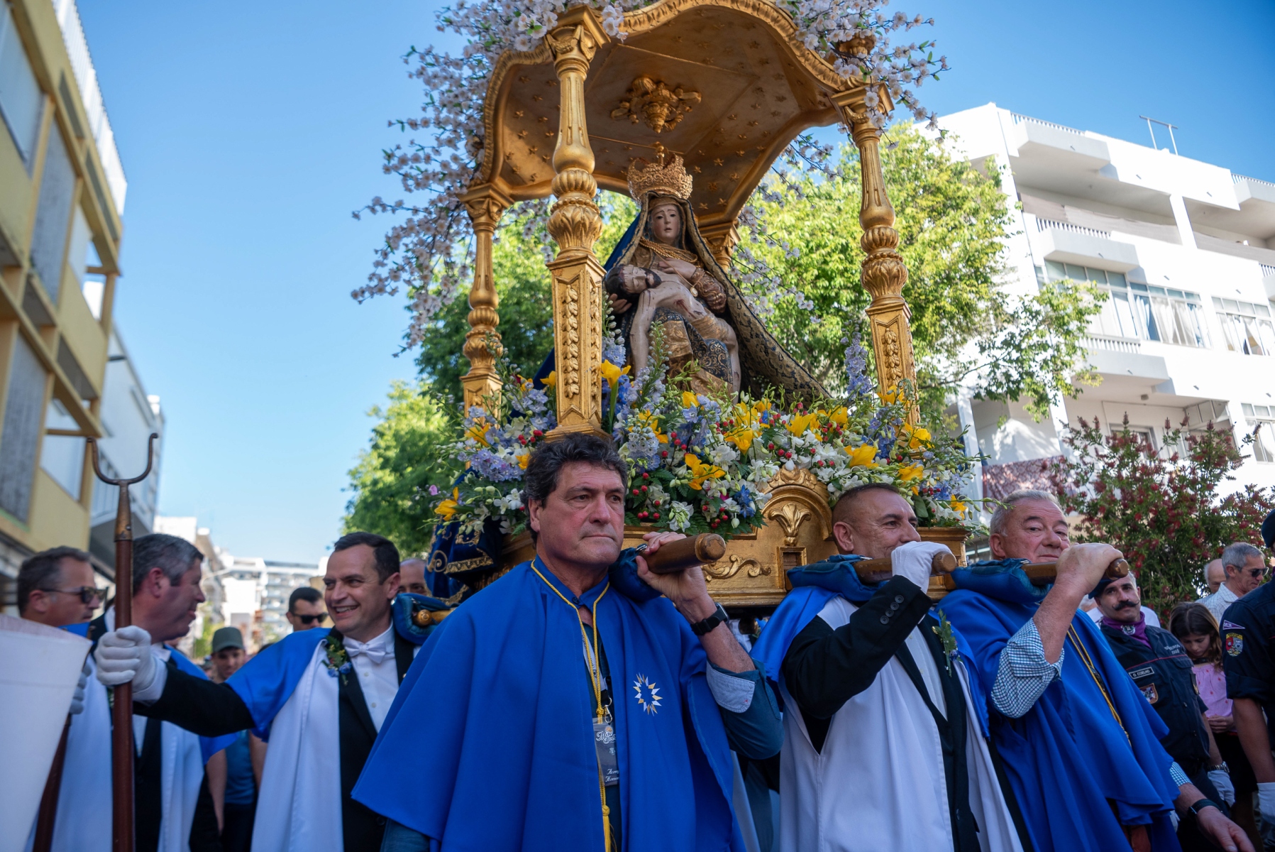 Ao esforço dos homens oito homens, vestidos de calças e opas brancas, que transportam a imagem de Virgem Maria com Jesus nos braços, aliou-se a força espiritual dos muitos milhares de fiéis que, em vivas inflamadas a Nossa Senhora da Piedade, acenando lenços ou em passo vivo e na cadência musicada dos homens da Banda Filarmónica Artistas de Minerva, «empurraram», calçada acima no calor da fé, o pesado andor da padroeira.